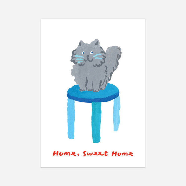푸른 스툴과 익살스러운 표정을 짓고 있는 고양이를 그렸습니다.
